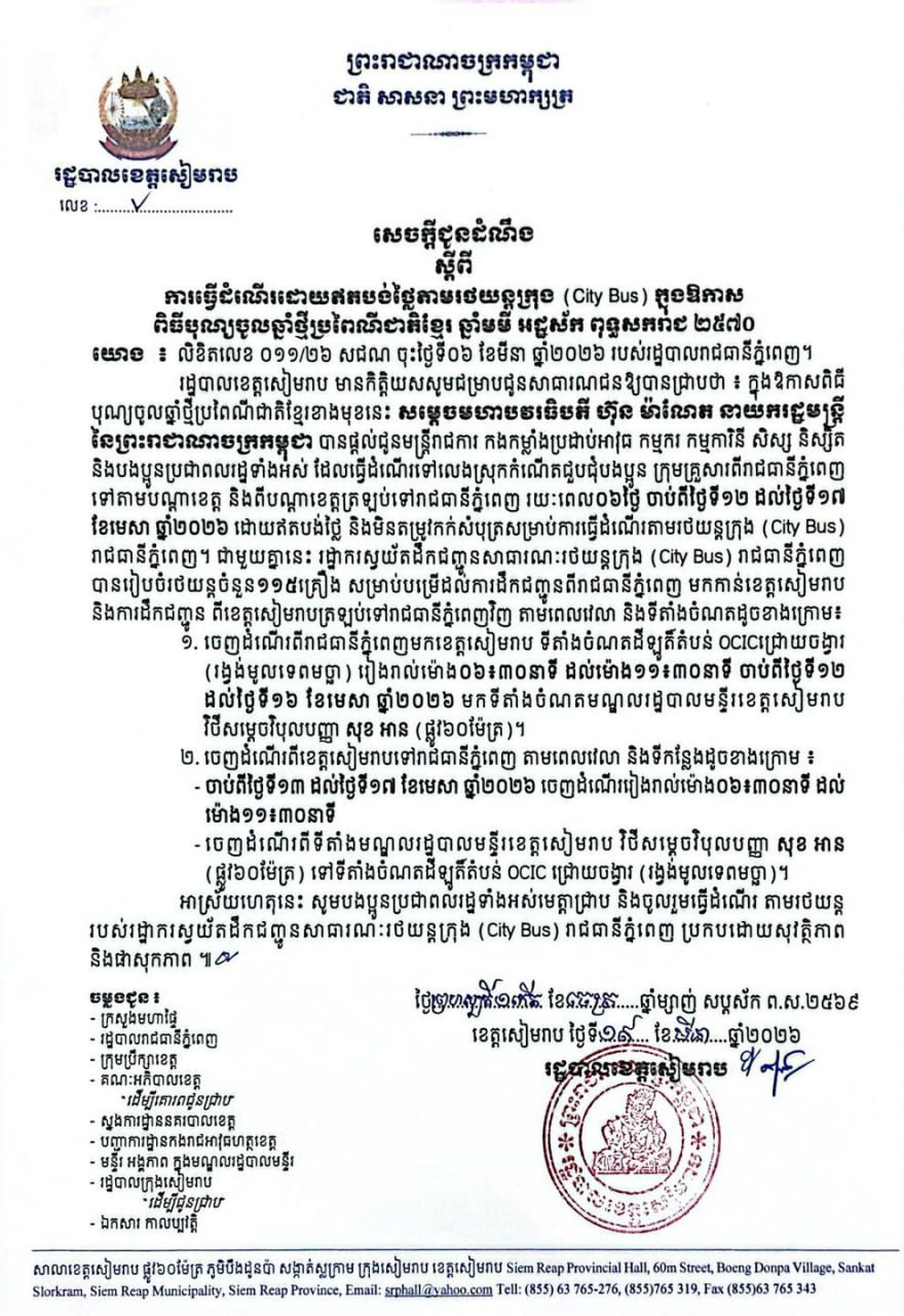 Siem Reap, March 20, 2026 — Siem Reap provincial authorities have announced free City Bus services during the upcoming Khmer New Year holiday, according to the provincial administration.
