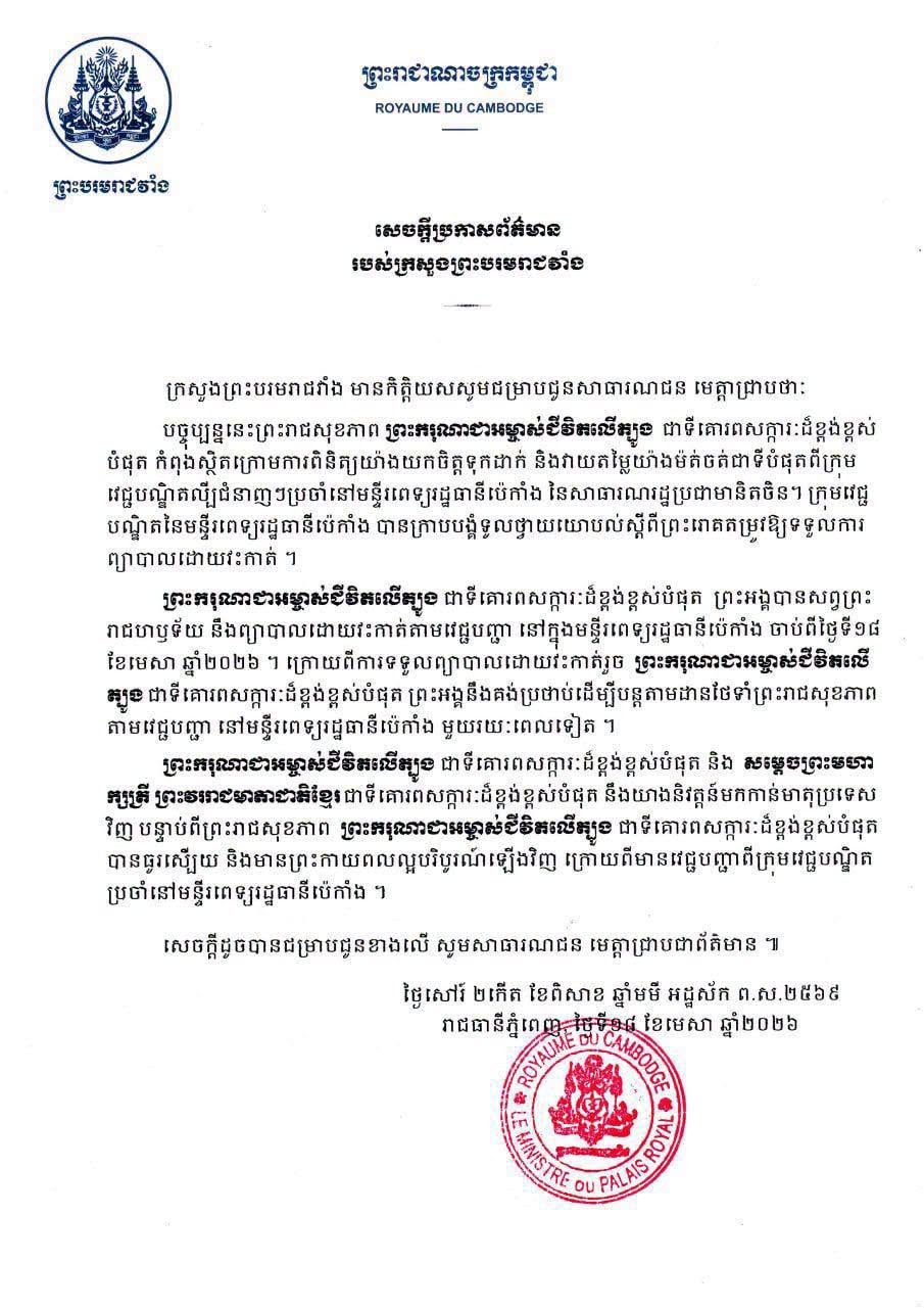 PHNOM PENH, April 18, 2026 — The Ministry of the Royal Palace has announced that His Majesty Norodom Sihamoni, King of Cambodia, is currently under close medical observation by a team of specialists at a hospital in Beijing.